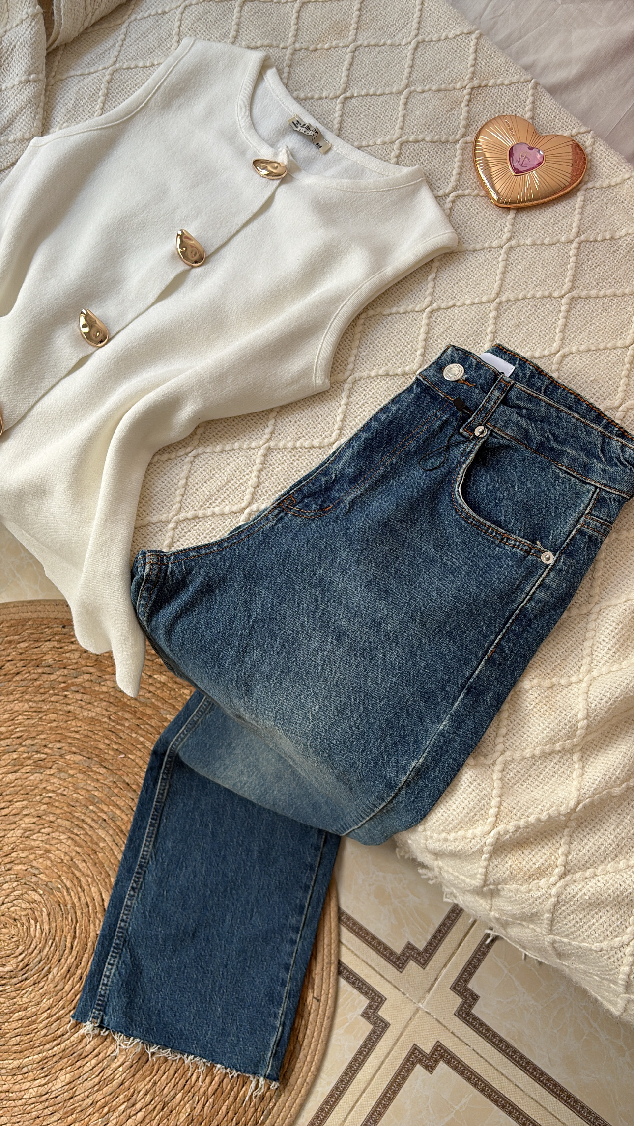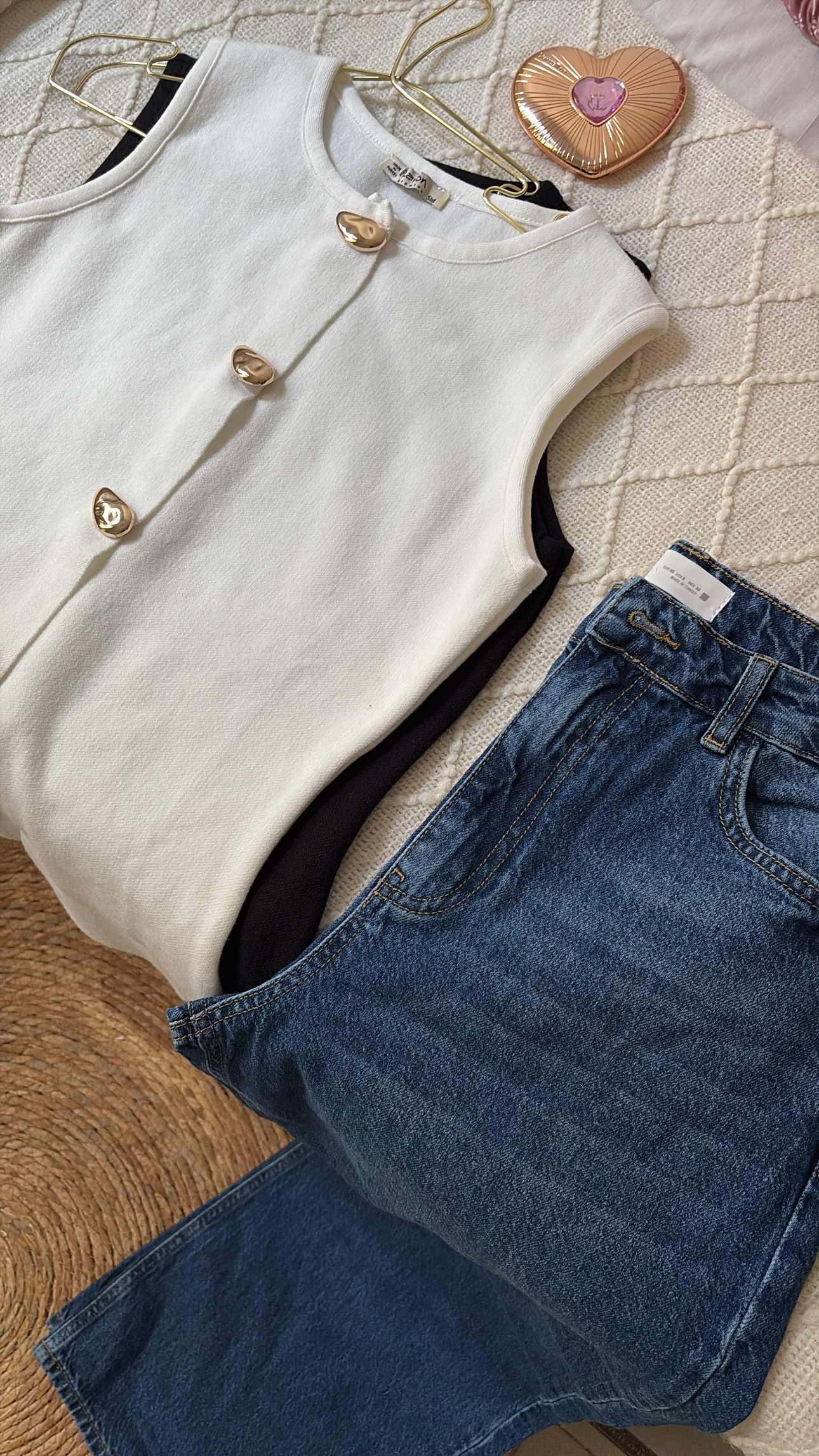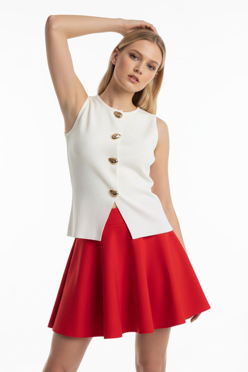 A timeless piece designed for a refined and effortless look. This elegant white sleeveless top features a structured silhouette with statement gold buttons that add a touch of sophistication. Its clean lines and minimalist design make it perfect for creating polished outfits, whether paired with skirts, tailored pants, or classic denim.