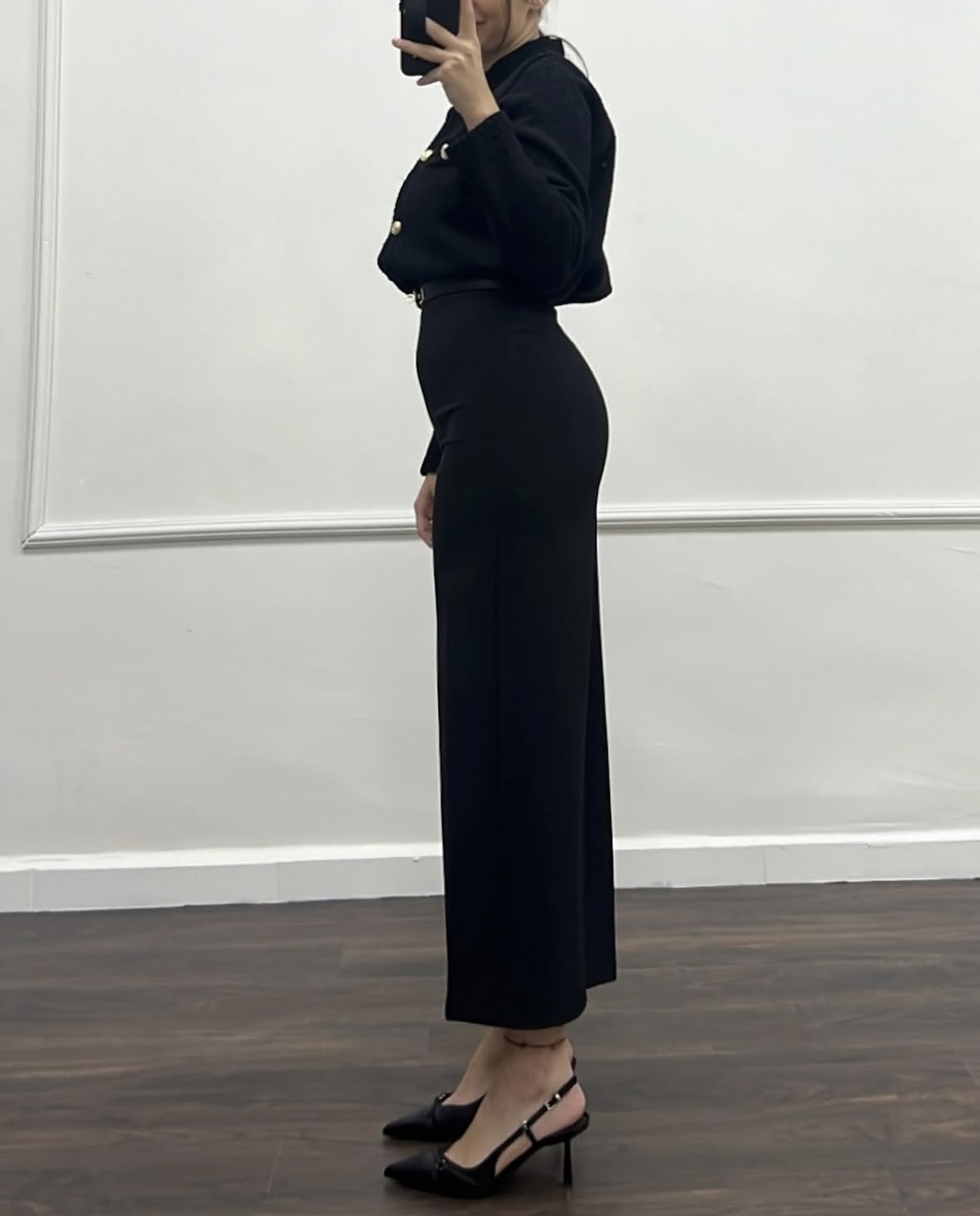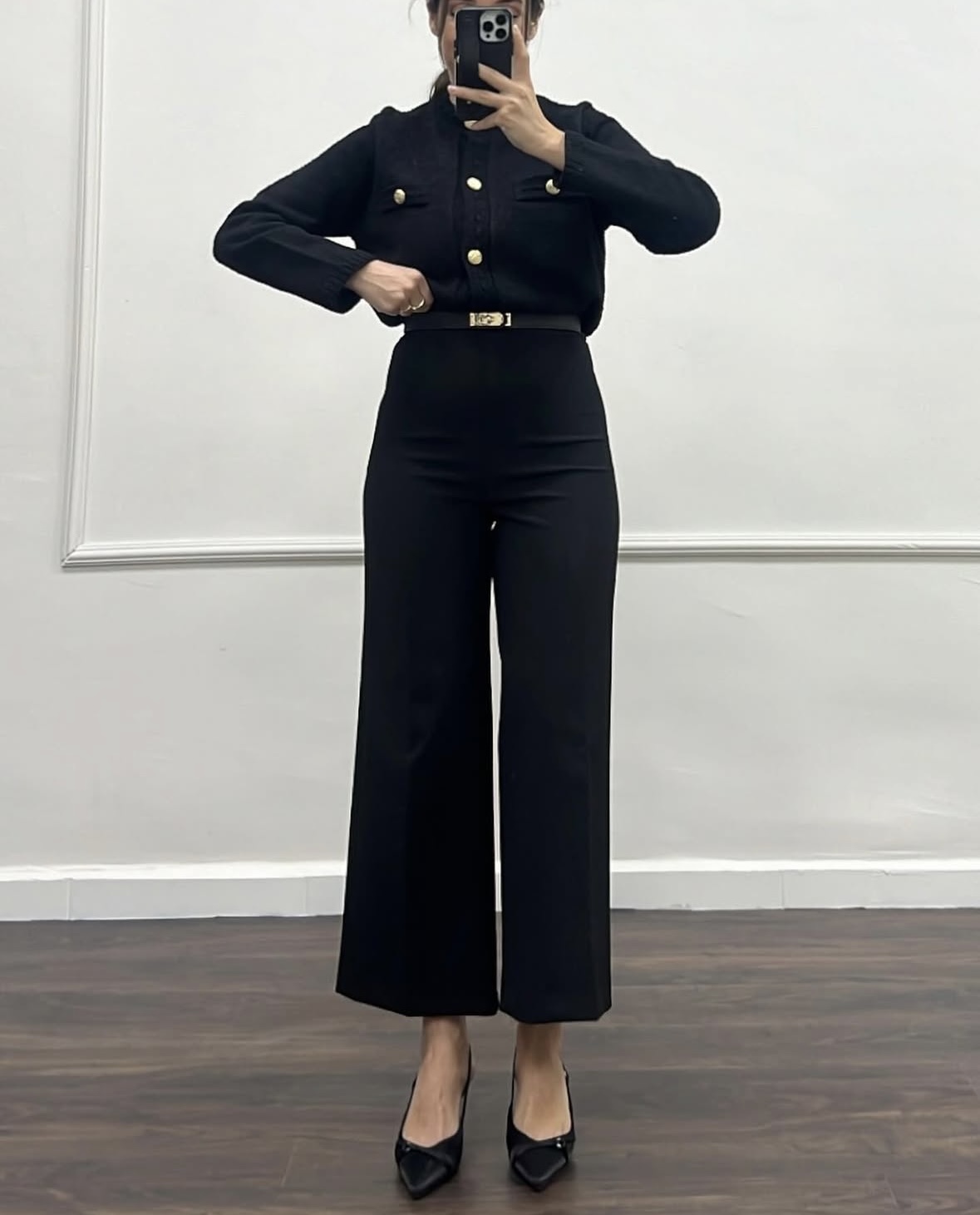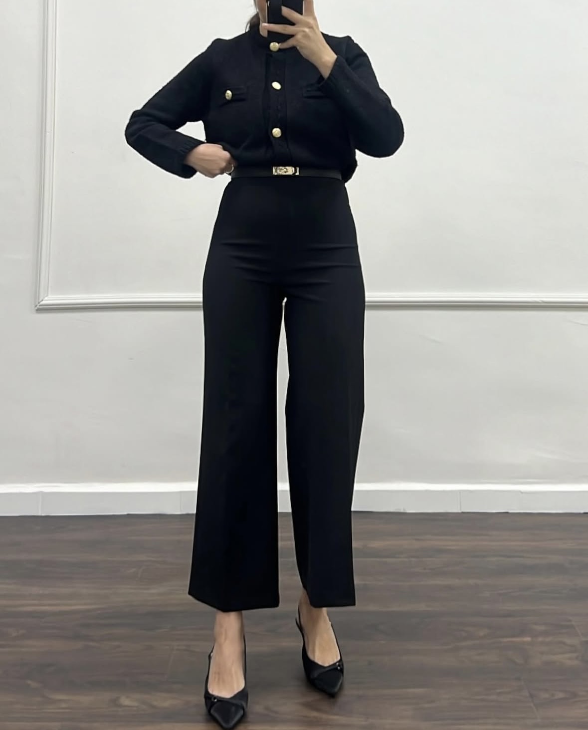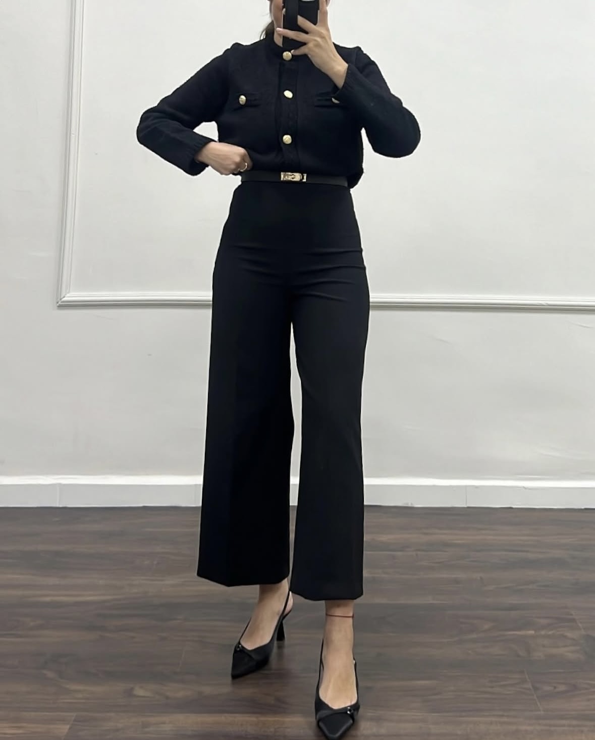 These high-waist wide-leg pants are the perfect blend of elegance and modern tailoring. Designed with a sleek silhouette, they cinch at the waist and flow into a structured wide leg, giving a lengthening effect to your figure. Crafted in a refined black fabric, they are versatile enough to transition from office chic to evening sophistication.