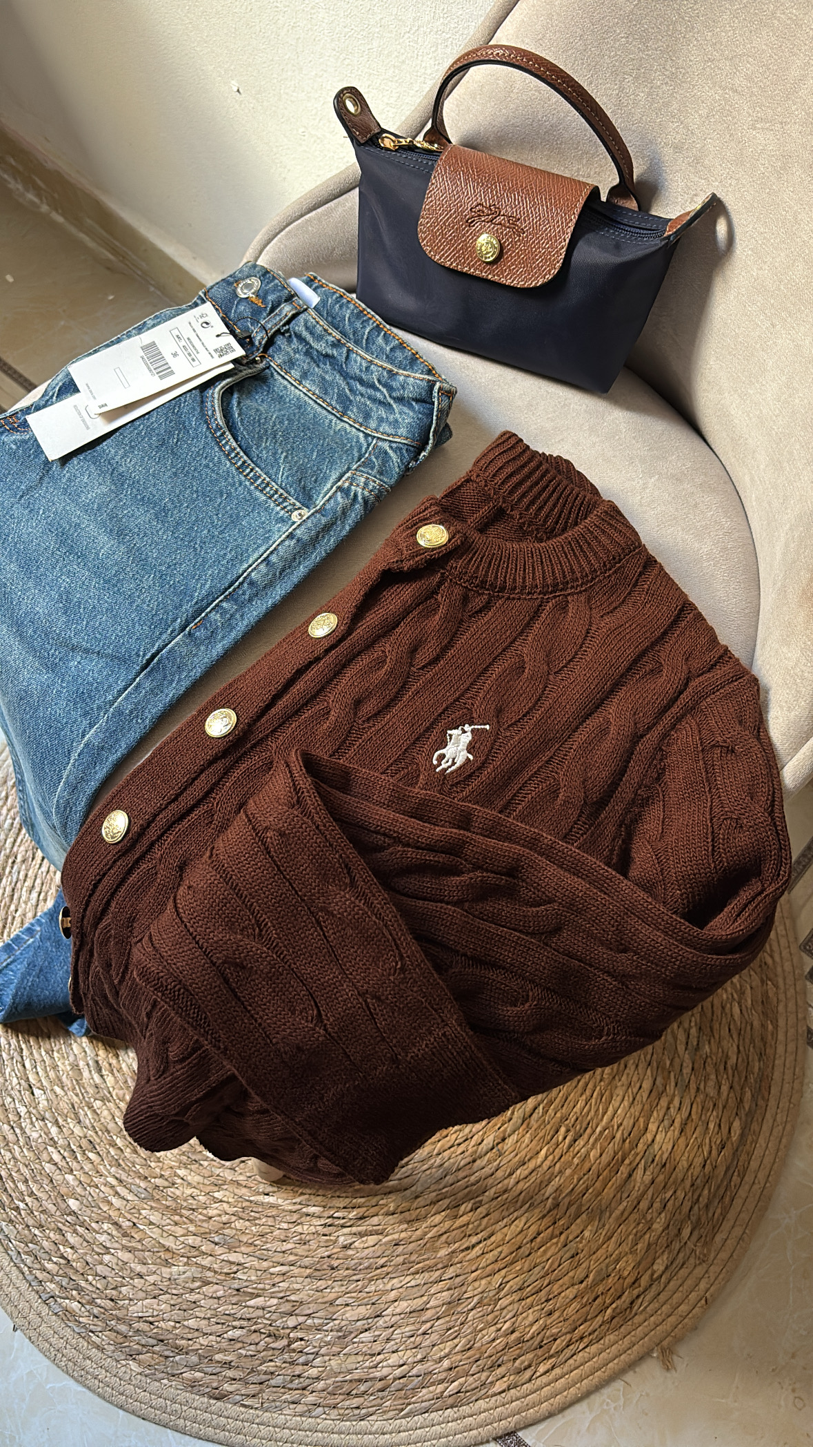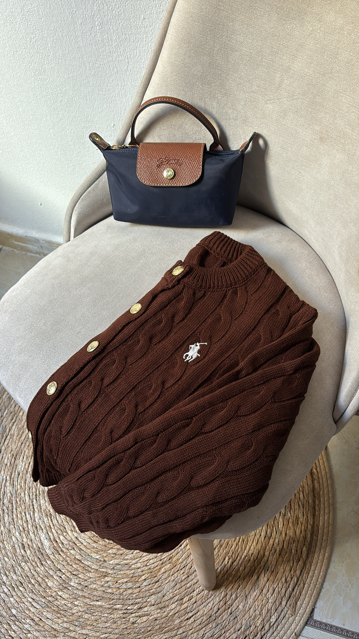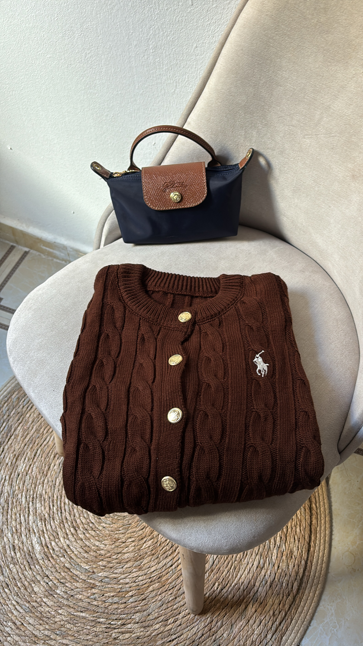 Discover effortless sophistication with this brown cable-knit Polo cardigan.