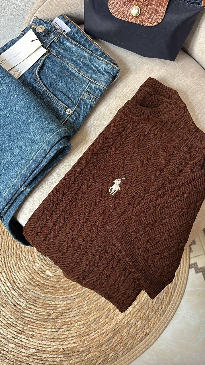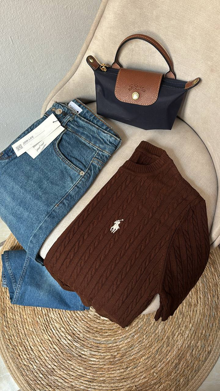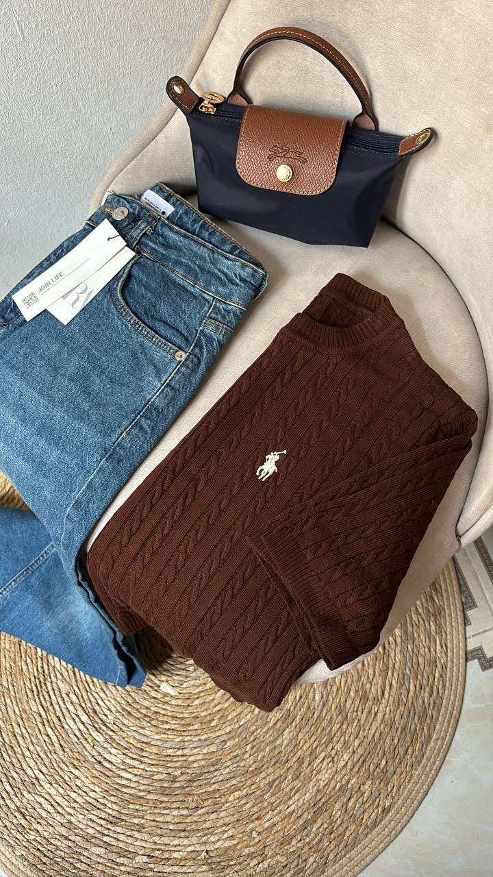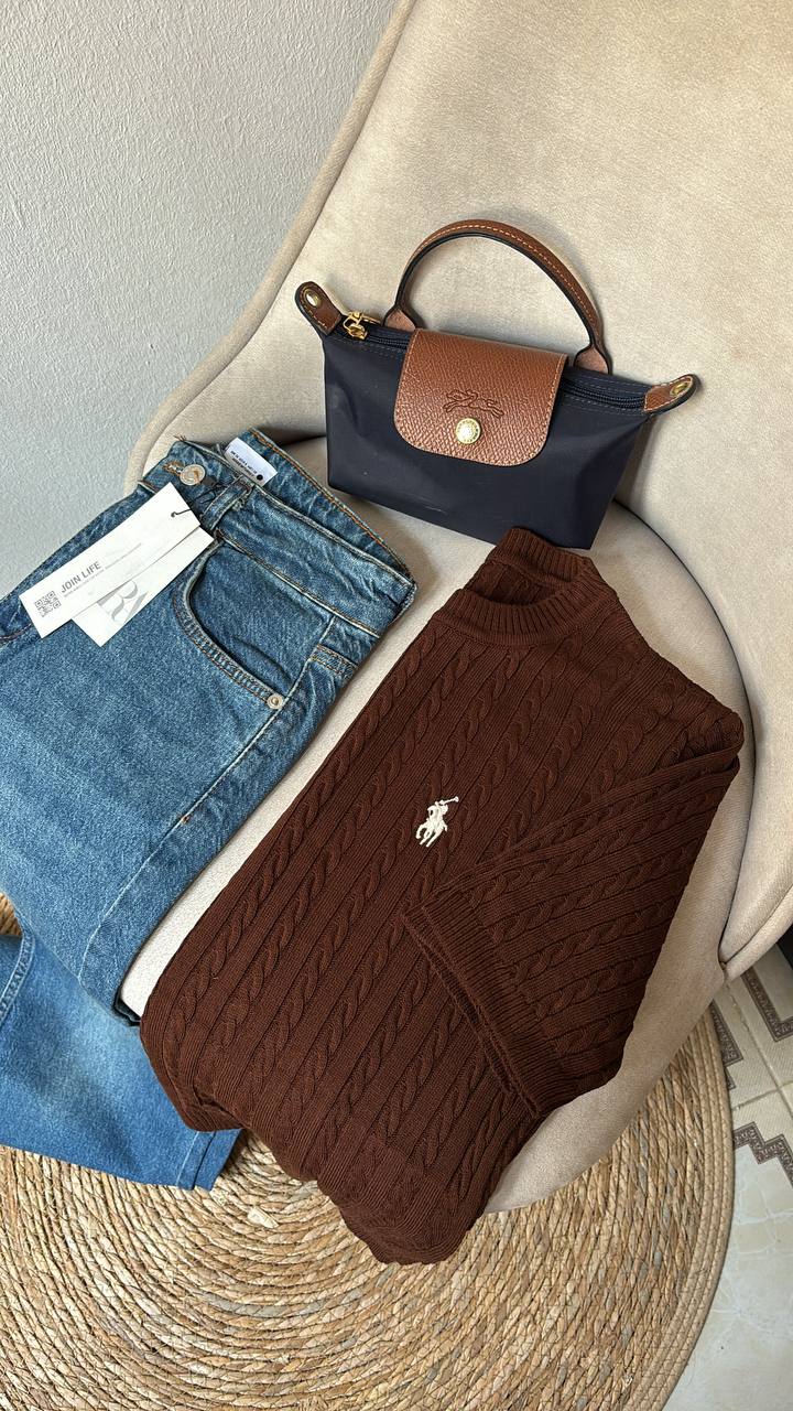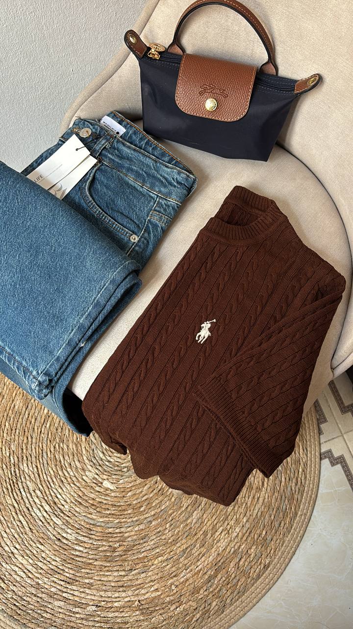 Style et polyvalence : Ce pull se marie parfaitement avec le jean présent sur l’image, créant un look décontracté-chic. Le marron est une couleur versatile qui s’accorde facilement avec de nombreuses pièces et accessoires, comme le sac Longchamp bleu marine visible sur la photo.