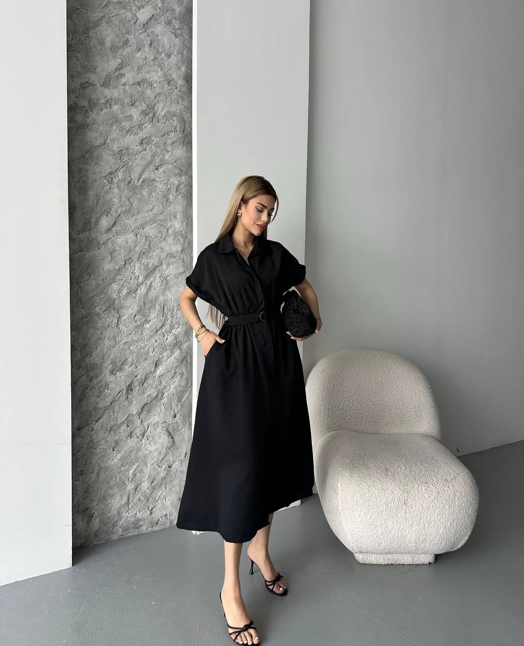 Cette robe chemise midi incarne l’élégance minimaliste contemporaine dans un noir intemporel et sophistiqué. Avec sa coupe fluide et sa ceinture ajustable, elle offre une silhouette féminine et polyvalente parfaite pour les occasions chic décontractées.