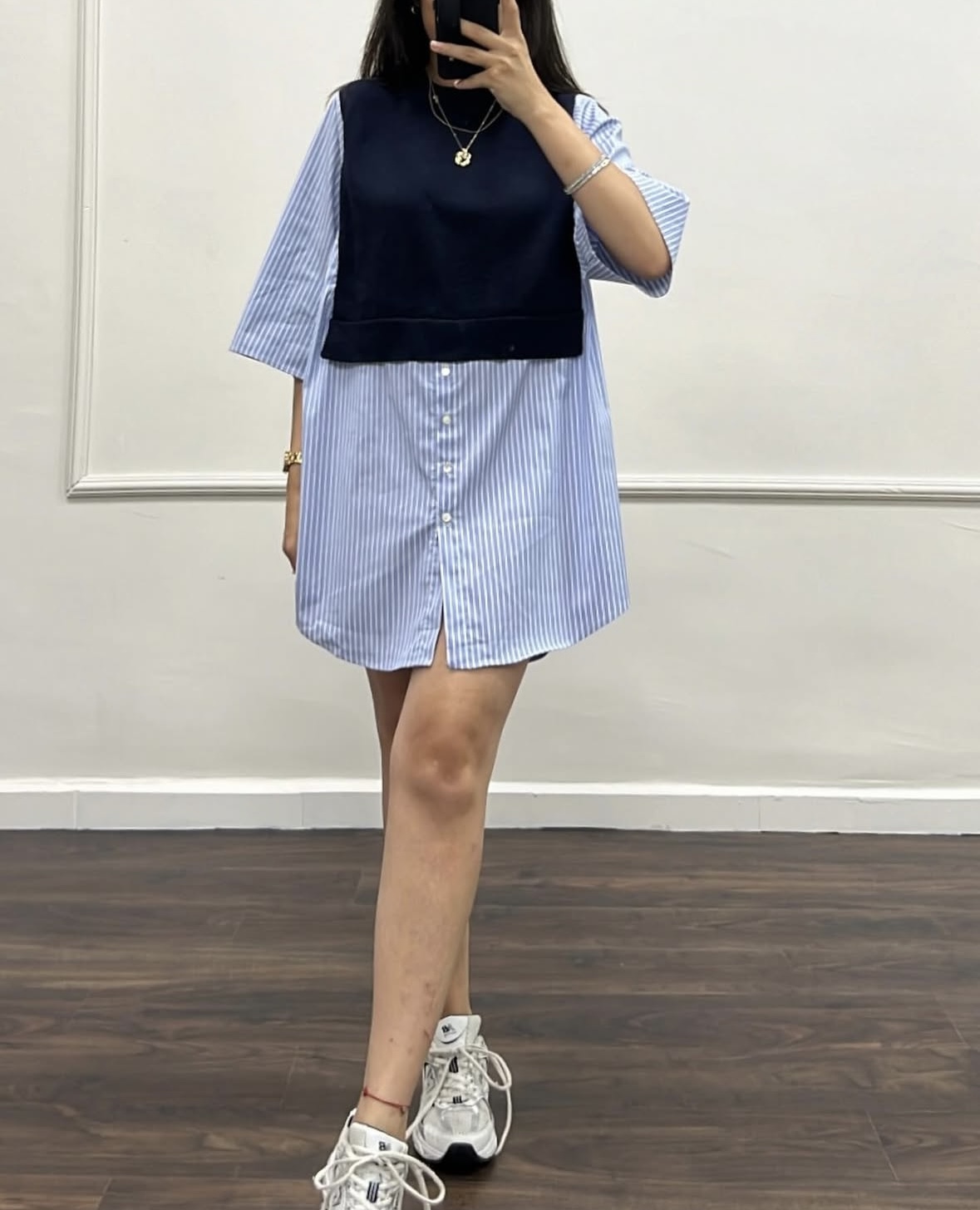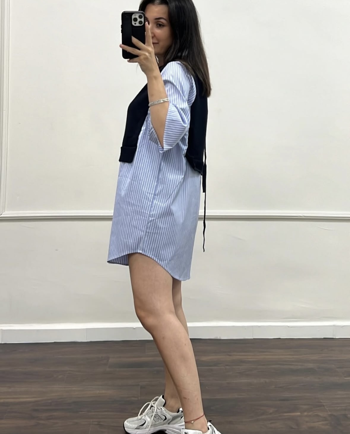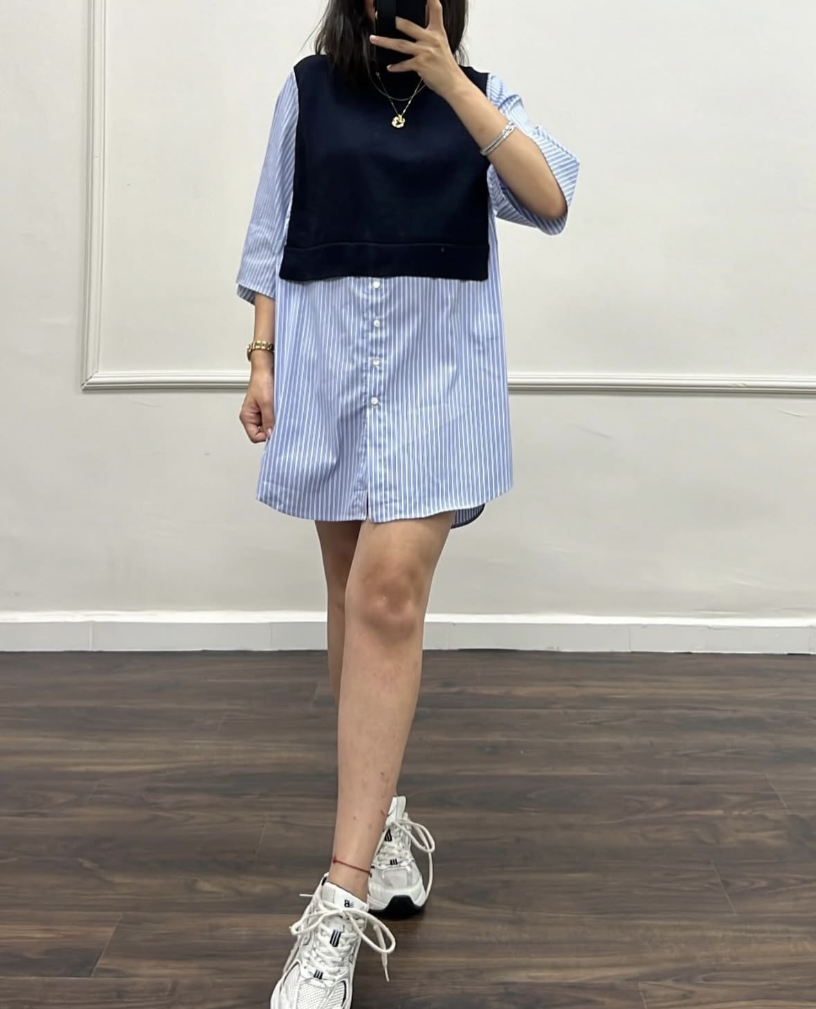 Effortlessly chic, this striped shirt dress is reimagined with a layered navy knit vest for a trendy, modern twist. The relaxed fit and button-down design give it a casual yet polished look, while the contrast vest adds structure and style. Perfect for a day out, pair it with sneakers for a sporty vibe or with loafers for a more refined touch.